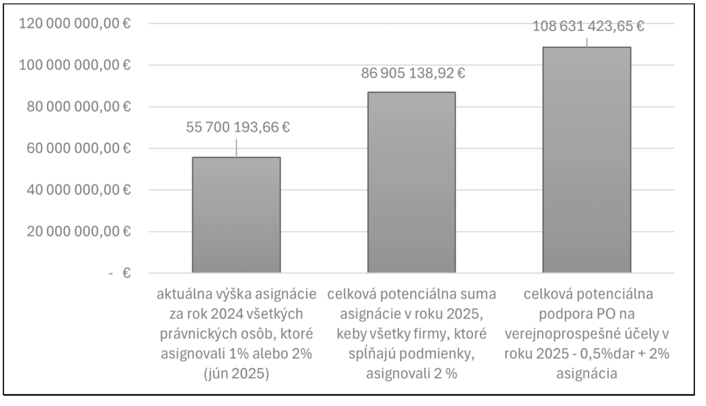Ak firmy preukážu dar vo výške 0,5 % na verejnoprospešné účely, môžu asignovať plné 2 %. Ak by všetky firmy, ktoré môžu asignovať v plnej výške 2%, tak aj urobili, objem zdrojov, ktoré by pritiekli oprávneným prijímateľom by sa zdvojnásobil.